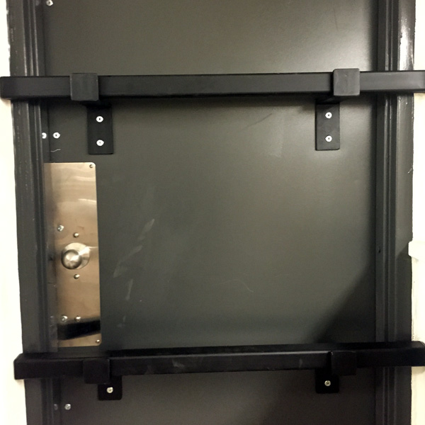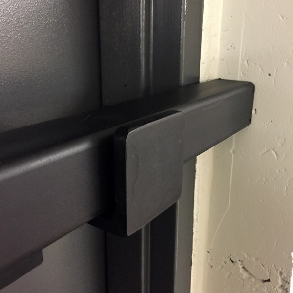 These guards prevent drilling through the door easily and prevent a hooked wire attack to pull on the push bar to release the latch. At the same time, they don’t interfere with push bar operation from inside.