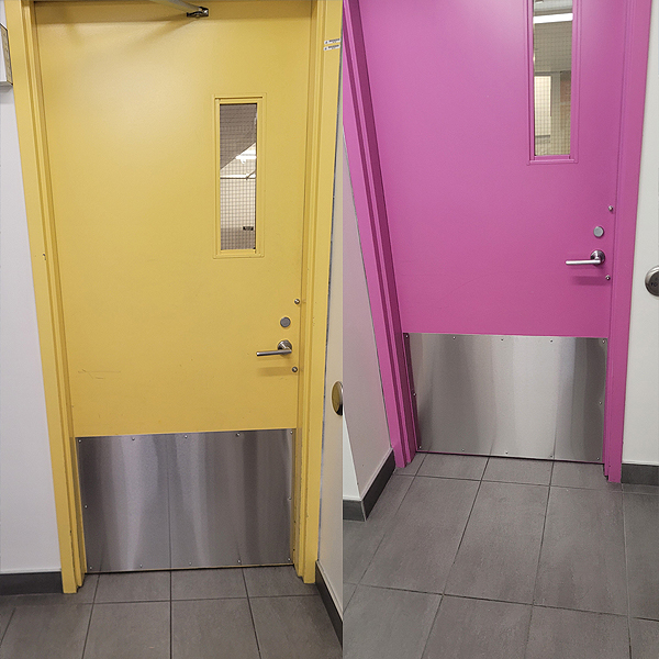 Garbage room doors frequently get damaged from rolling garbage bins in and out of the room. Over time, this causes the door seams to delaminate and eventually the doors will need to be replaced.