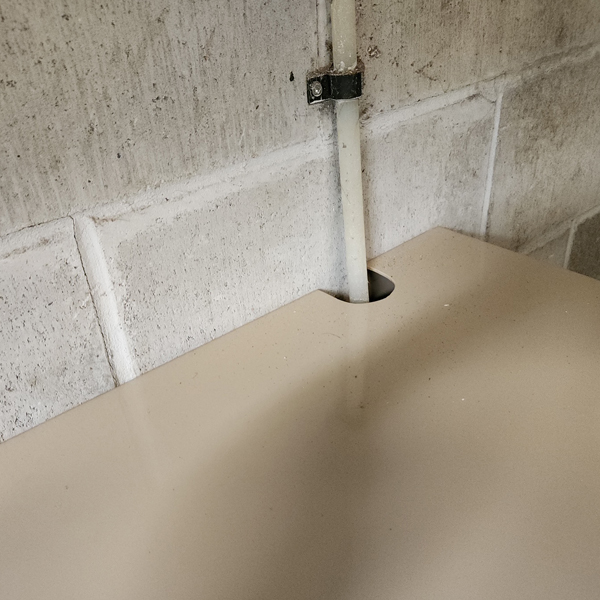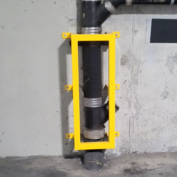 Most warehouses and large commercial spaces have interior roof drain downspouts that are vulnerable to getting damaged by forklifts or other equipment. Surrounding them with a high visibility heavy steel guard is the best way to prevent damage and possible flooding of the space if the downspout is damaged during rainy periods.
