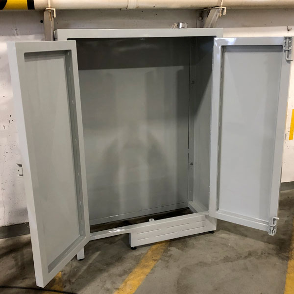 We fabricate custom cabinets to your specification. All cabinets have NRP (non-removable pin) hinges on the doors and can be made with a variety of heavy duty locks. This one has a shrouded puck lock.