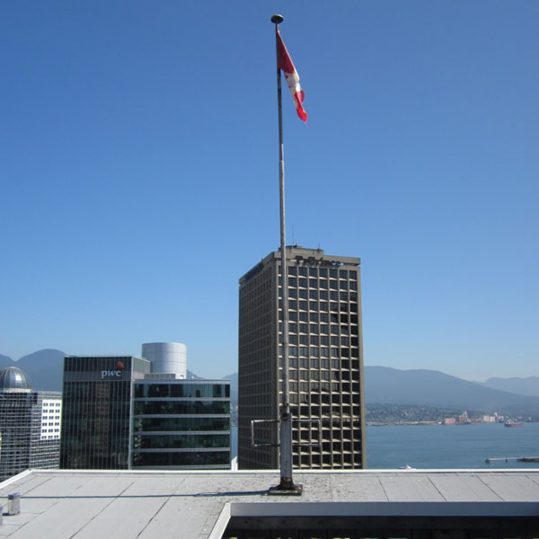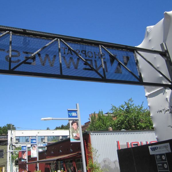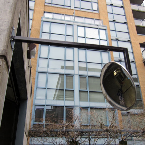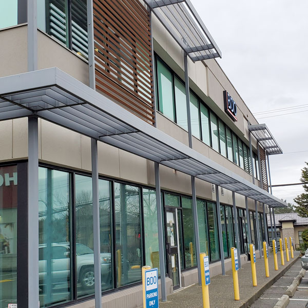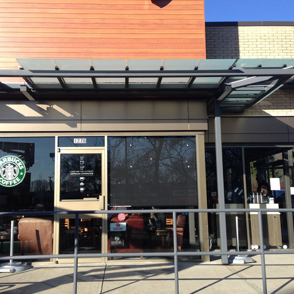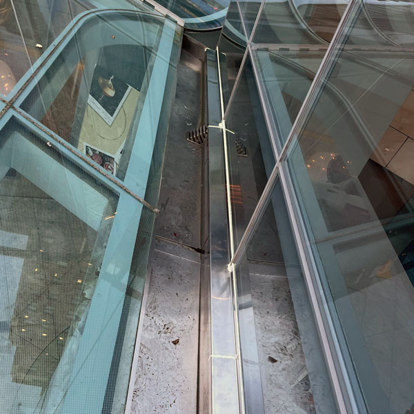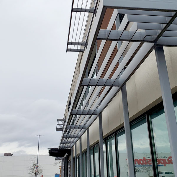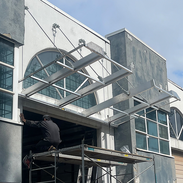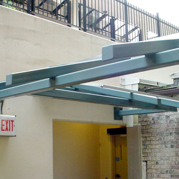 Steel frame set in rebar reinforced concrete. The sidewalk was repaired afterwards and glass installed. Awning features a back gutter and drainage downspout.