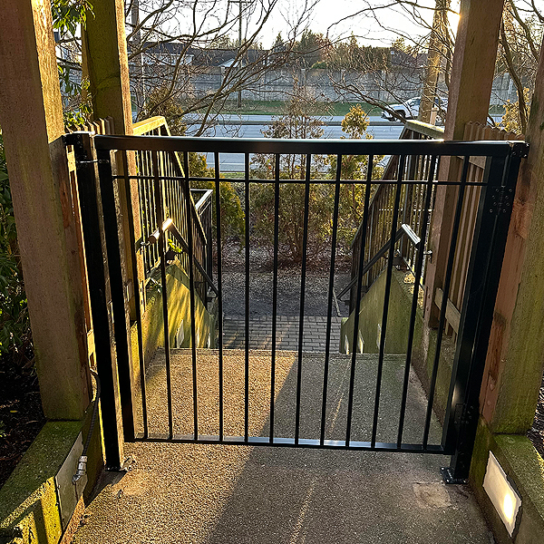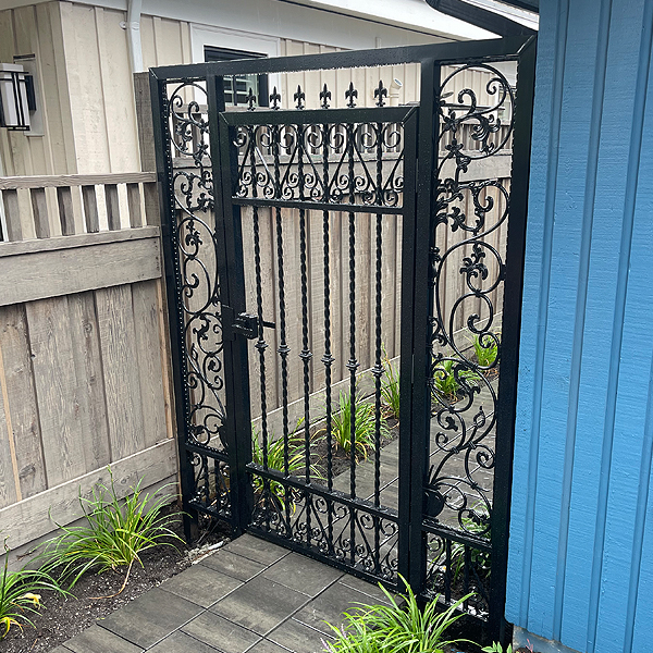 Custom-crafted wrought iron components featuring intricate design work and durable construction. Installed with secure mounting and powder-coated finish for weather resistance.